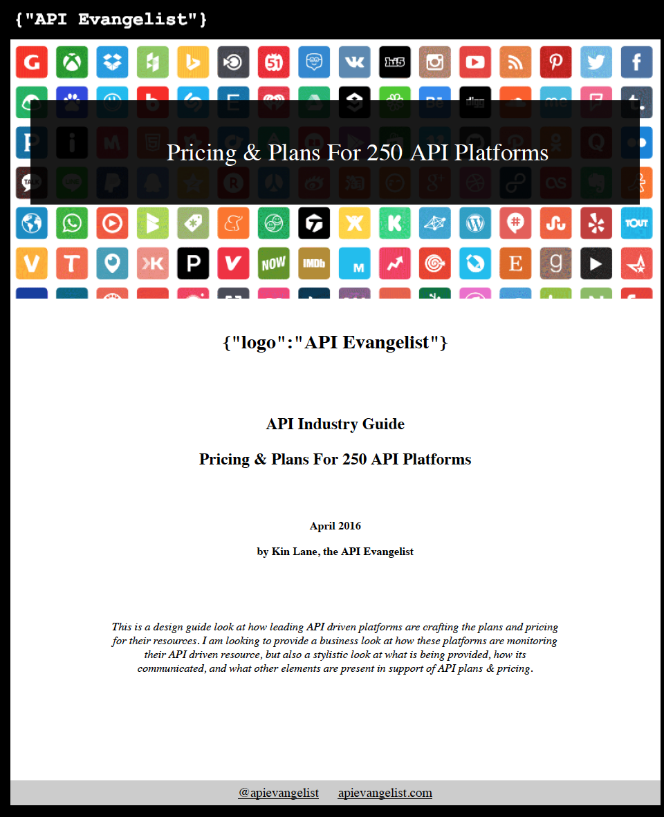 Highlights from my monitoring of the API space, in the form of an API plans and pricing design guide. I've gathered 250 of the leading API driven platforms, providing snapshots of their plans and pricing pages, provide insight into how these provides are monetizing their digital resources using APIs. This guide provides snapshots and links to the pricing and plan page for each platform that is included.